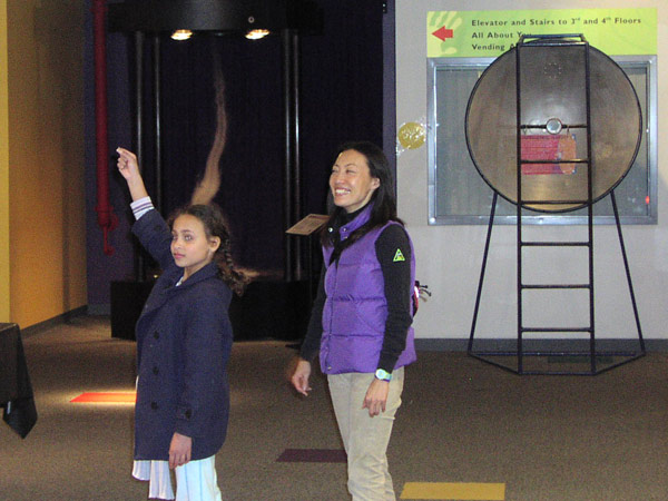 To demonstrate how a transit works and how empty space is, a small pin was used to represent the planet Mercury (the young woman is holding the pin in her hand, but it is too small to see with this resolution). The yellow circle on the wall in the back represents the sun. Not seen in this photo, and several feet away, a different small pin represented the planet Earth.